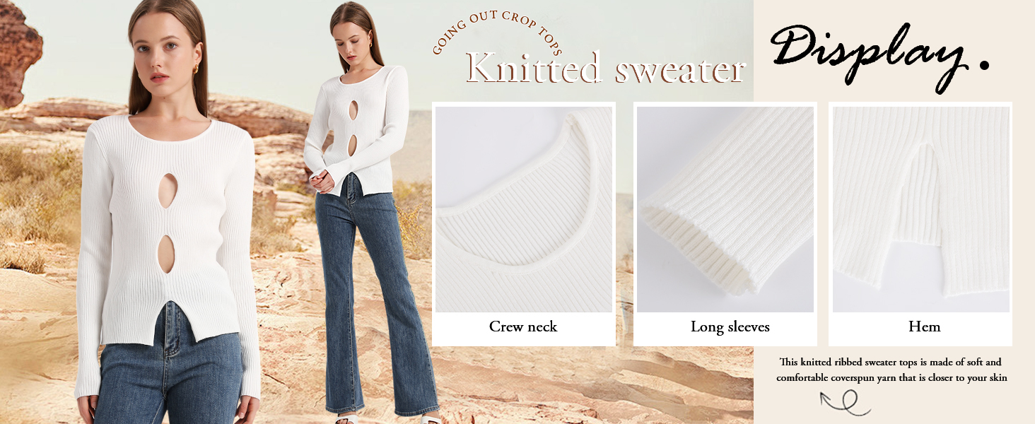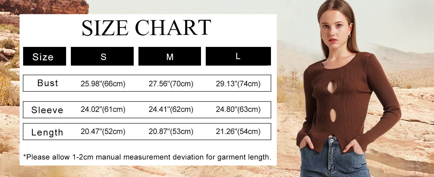- u003Cliu003Eu003Cspan class=u0022a-list-item a-size-base a-color-baseu0022u003ESIZE: S=US(4-6), M=US(8-10), L=US(12-14), XL=US(16-18), please refer to the size chart before purchasing this sexy knit sweater top.u003C/spanu003Eu003C/liu003E u003Cliu003Eu003Cspan class=u0022a-list-item a-size-base a-color-baseu0022u003EFabric: Cutout knit crop top made of skin-friendly and warm knit fabric, comfort to wear, chic cutting design paired with cozy material, an ideal choice for women.u003C/spanu003Eu003C/liu003E u003Cliu003Eu003Cspan class=u0022a-list-item a-size-base a-color-baseu0022u003EFeature: Sexy Knit Sweaters/Slim Fit Crop Top/Cutout Knitted Top/Trendy Pullover Sweaters/Mock Neck Sweater/Drop Shoulder Sweater/Hollow Out Going Out Tops/Casual Ribbed Knitted Sweater.u003C/spanu003Eu003C/liu003E u003Cliu003Eu003Cspan class=u0022a-list-item a-size-base a-color-baseu0022u003EMatch: Y2K knitted sweaters can be worn alone in spring and autumn, or worn under a coat in winter, goes well with vest, jacket, skirt, jeans, leggings for a sexy look.u003C/spanu003Eu003C/liu003E u003Cliu003Eu003Cspan class=u0022a-list-item a-size-base a-color-baseu0022u003EOccasion: Slim fit knit top great for daily wear, outdoor, street, date, work, office, shopping, party, work, a versitile sweater for women in spring/fall/winter.u003C/spanu003Eu003C/liu003E
